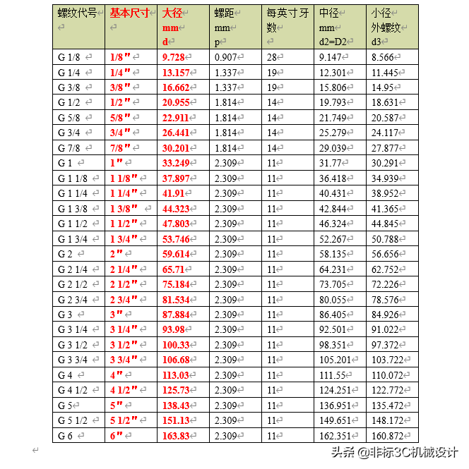 對于G開頭的,或者說是對于英制螺紋來說,同樣用卡尺量下螺紋的最外面的尺寸,但這個只是大徑尺寸(mm),在下表中找多對應(yīng)的代號: