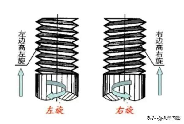 擴展:1.螺紋旋向快速判別放法:將螺桿垂直于地面,看螺紋牙的那條斜線,左邊高左旋,右邊高右旋;右旋螺紋順時針擰時旋入,左旋順時針擰旋出,如下圖;