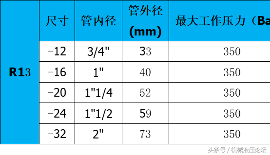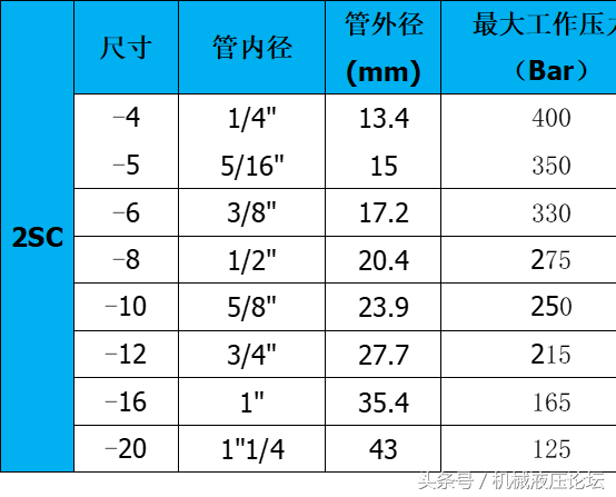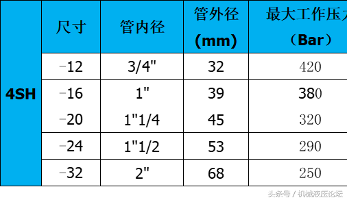 附:常用液壓膠管內外徑及最高工作壓力參數